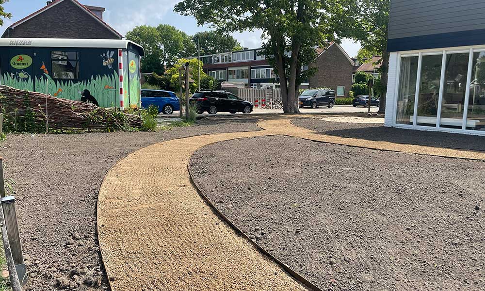 De realisatie is begin juli echt begonnen. Groenst heeft een begin gemaakt met het maken van de kantopsluiting van de paden van Cortenstaal. De lijnen werden nu goed zichtbaar. Grond werd aangevuld en de eerste laag van zand kwam in de paden. Op 26 juli werd met een flinke groep vrijwilligers het pad volgereden met het padvast, een hele klus… en het werd ontzettend warm naarmate de dag vorderde… er werd veel gedronken maar de inzet en stemming bleven top! En ook hier weer: vele handen maken licht werk, het lag er net na de middag allemaal in! Op naar de vakantie en daarna de volgende actie met deze fantastische ploeg plannen!