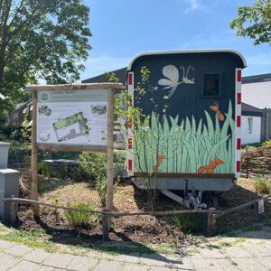 Op zaterdag 3 mei is het project gestart met de aanleg van een levende modeltuin waarin onze afgeschreven maar kleurrijke keetwagen een prominente plek heeft gekregen. Deze trekt de aandacht, want met de tuinbeestjes erop van Len Munnik, ziet hij er erg gezellig uit en zegt hij alles over wat er leeft in een tuin. We hebben diverse elementen die in het plan terugkomen, verwerkt in de modeltuin. Zo krijgen voorbijgangers en belanghebbenden beeld van wat het straks in het echt gaat worden.