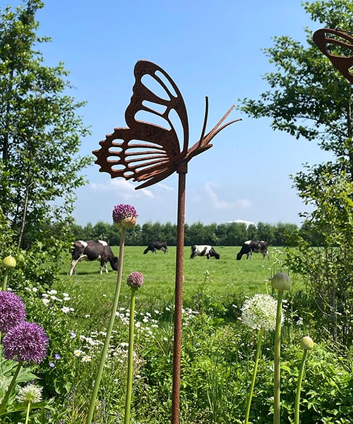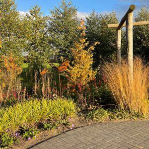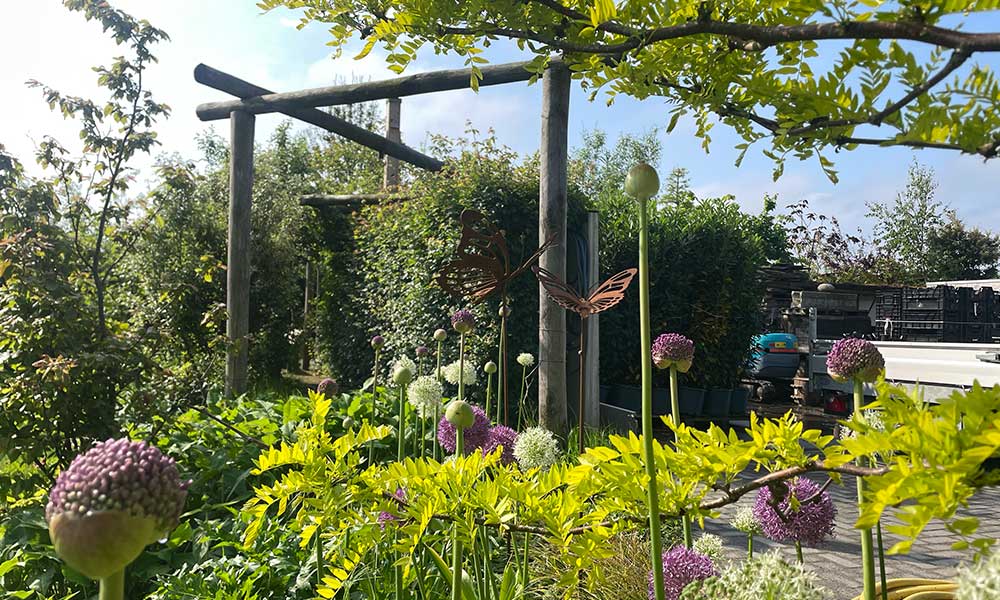 Na aanleg en oplevering van een tuin komen we er vaak pas veel later weer terug en soms zelfs nooit meer… Een tuin is altijd in beweging, maar hoe kom je er dan achter of je ontwerp en aanleg wel het gewenste resultaat op termijn geven? Klopt de werkelijkheid wel bij het plaatje wat je had bedacht… Zo ontstond naast ons bedrijf een “eigen” tuin, met planten die we zo elke dag zien en meemaken, hoe ze groeien en bloeien in elk seizoen. Met organische vormen werden de paden en borders gevormd. De formule van de levende tuin werd verwerkt in de elementen die je hier kunt vinden: hergebruikte materialen, het omgaan met regenwater, eten uit de tuin, natuurlijke materialen en uiteraard de beplanting. De tuin rondom onze loods is door de jaren heen uitgegroeid tot het Groenst Inspiratie Erf. We plantten er bomen en er kwamen vogels, we plantten er bloemen en de hommels, bijtjes en vlinders wisten ons te vinden. Wonderlijk wat er gebeurt als je groen aanplant. Dit verhaal brengen we graag verder: dit maak je mee als je een groene tuin aanlegt.